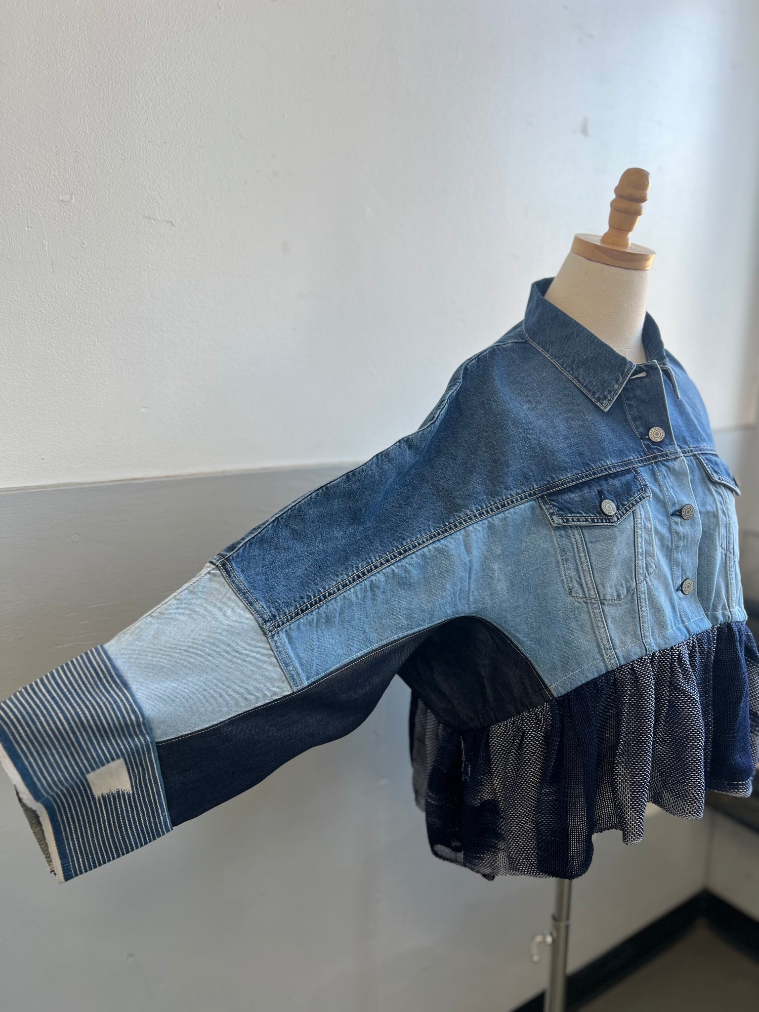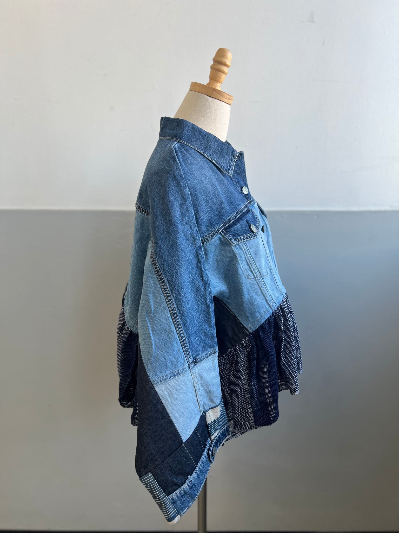 I remade this jacket from a new teen denim piece, redesigning it with raglan sleeves and adding another layer of denim for a more comfortable fit.