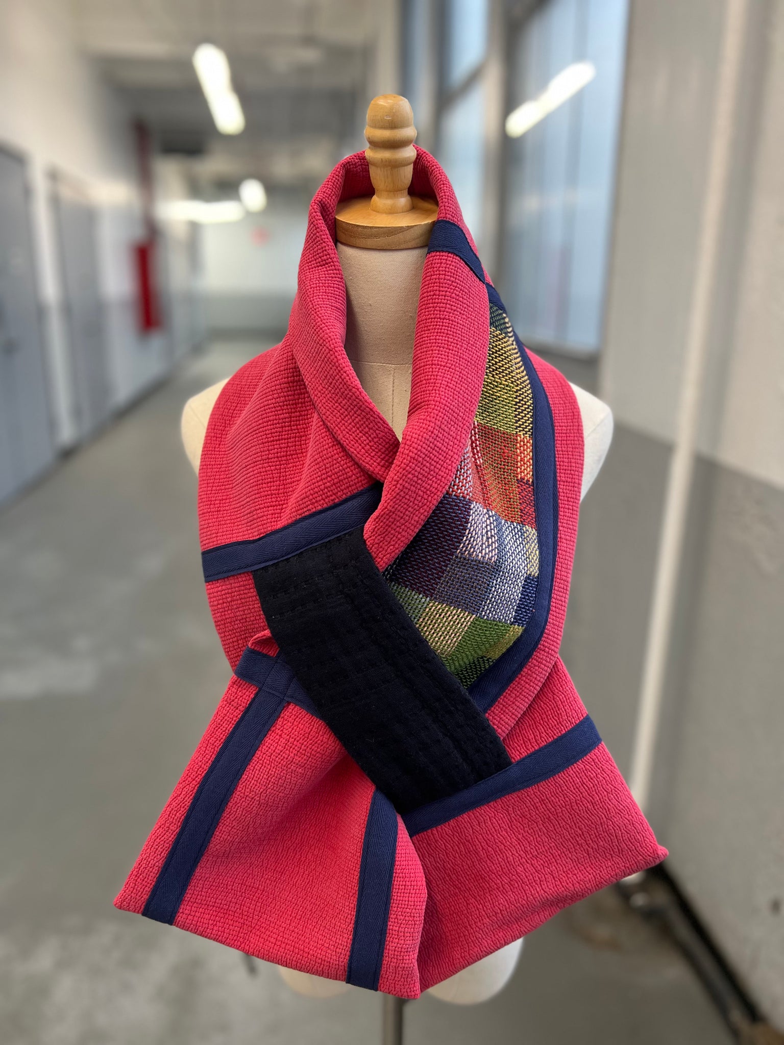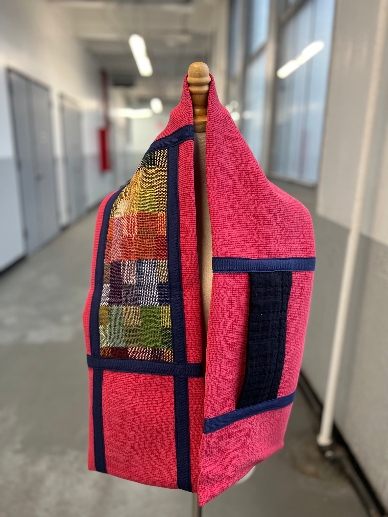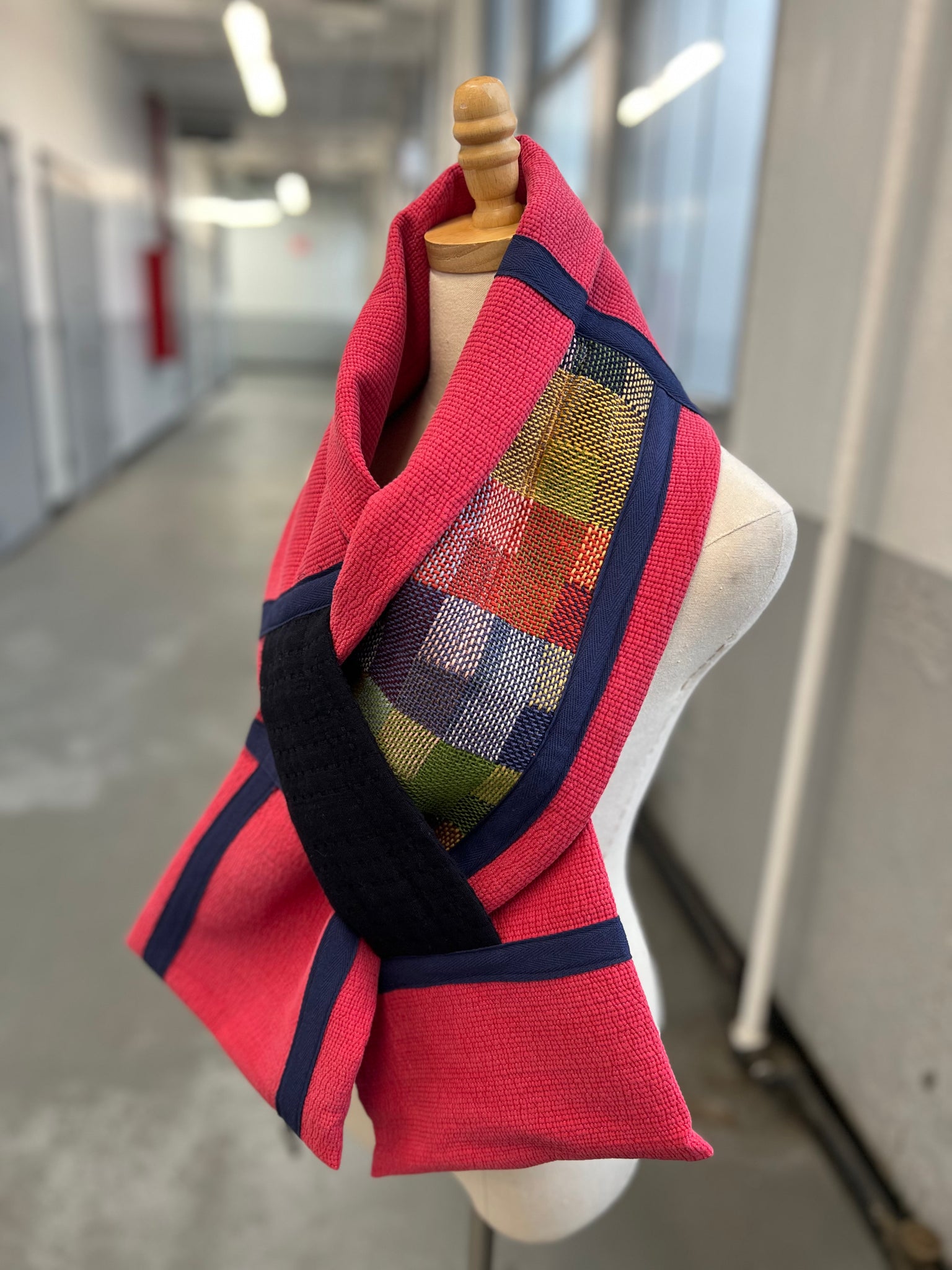 This scarf is crafted from my leftover materials, including handwoven fabrics, resulting in a unique patchwork design created meticulously, piece by piece. Each detail is intriguing and entirely one-of-a-kind, showcasing the beauty of handmade artistry.